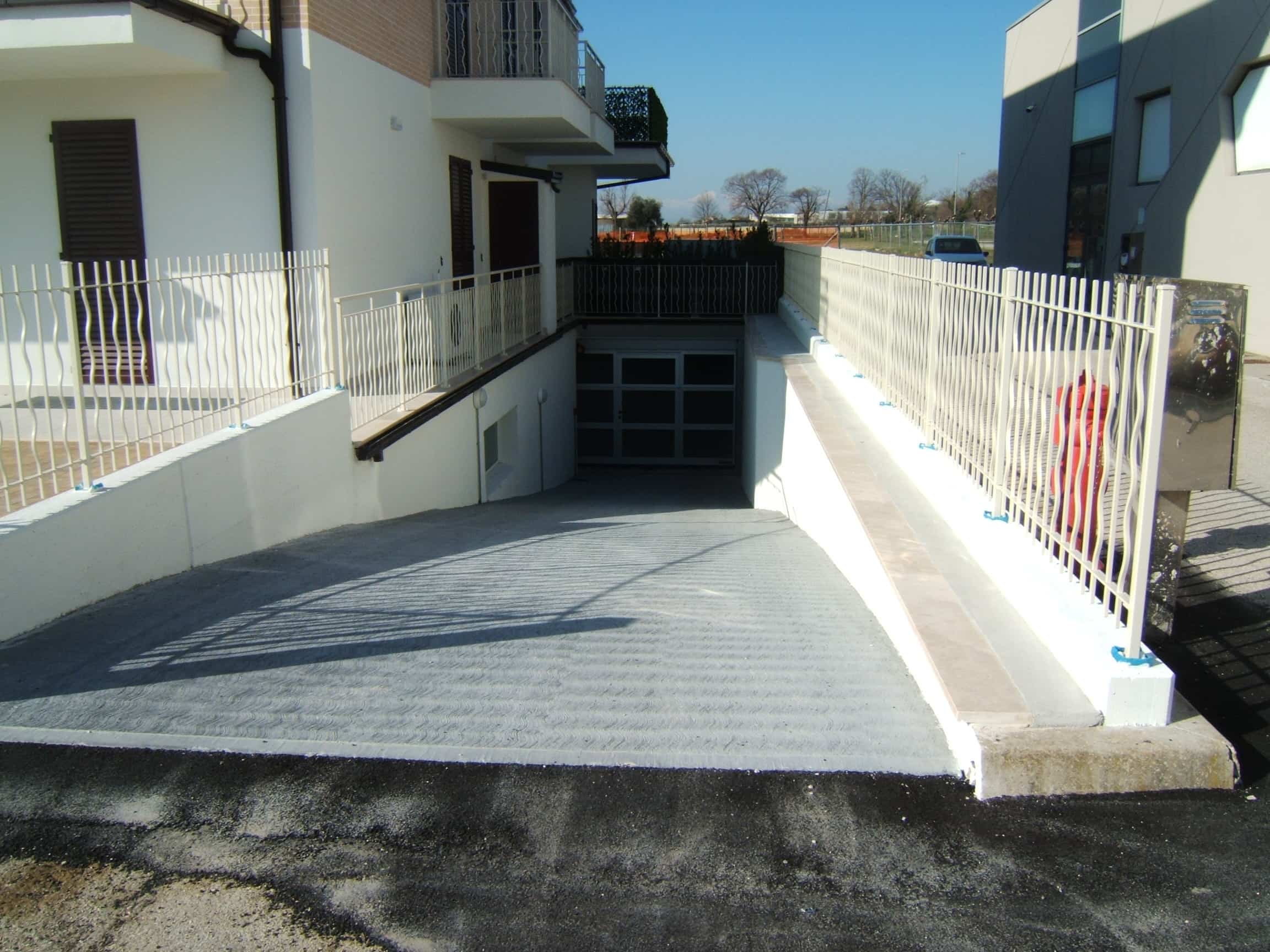 Il piano interrato ospita i garage, accessibili con una comoda corsia di manovra, e accesso al vano scala/ascensore. Le quattro unità abitative al piano terra sono provviste di corte esterna a uso riservato, divisa in area pavimentata e zona giardino.